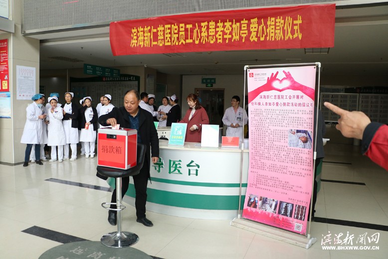 近日,滨海新仁慈医院发动全体员工为贫困的骨科患者李如亭捐款。