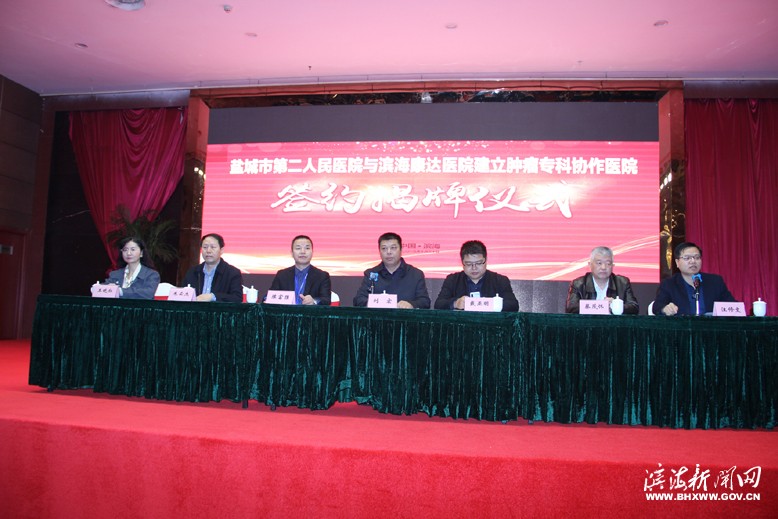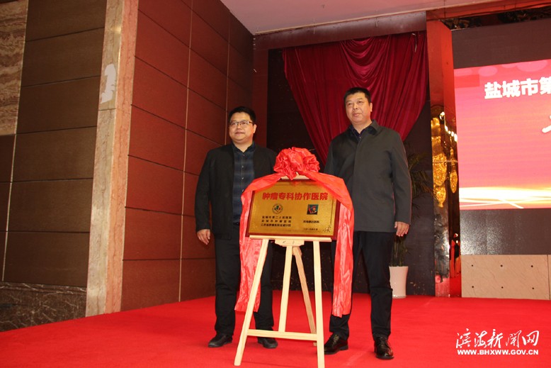 在热烈的掌声中,刘宏、戴亚明一起为“盐城市二院、盐城市肿瘤医院、滨海康达医院肿瘤专科协作医院”揭牌,现场一片欢乐。