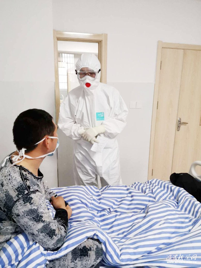 在隔离病房,沈玉成从头武装到脚,防护服、护目镜、帽子、口罩、鞋套、手套等把他身体裹得密不透风,每次查房1个多小时,他的后背就湿透了。“每天都可以做好几个小时的‘桑拿’,想想也很不错!”沈玉成调侃而乐观地向笔者描述工作情景。