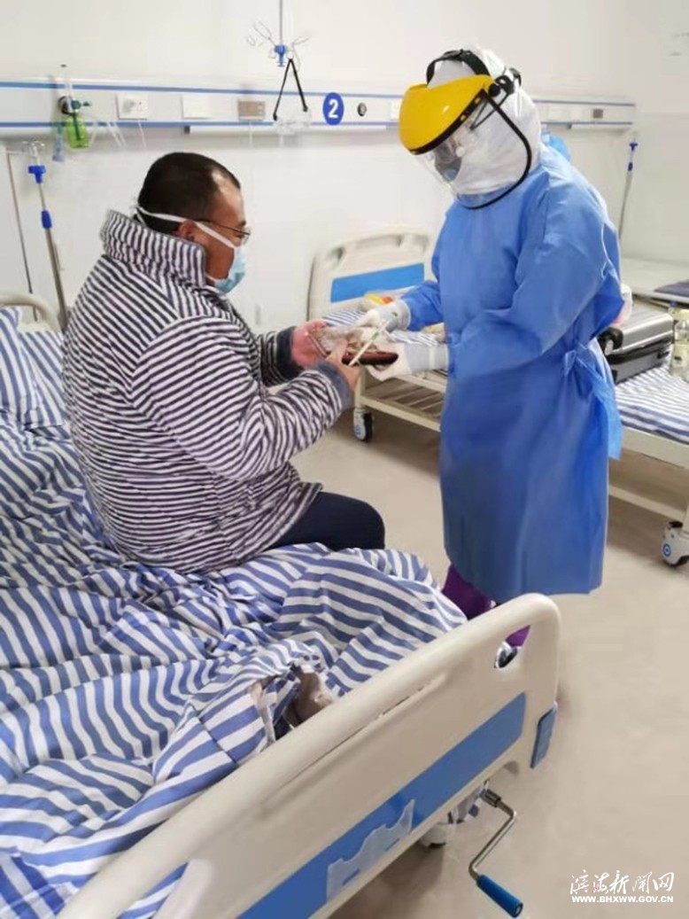 我先被分在发热患者隔离留观病房。或许,应了那句老话,“初生牛犊不怕虎”。我一点没感觉到害怕。第一次戴着双层手套,我只是有点担心穿刺不成功,所幸运气还不错。每当进去上班的时候,我都能深刻理解里面的病人。换位思考一下,当你看到武装齐全的医护人员,每做一次操作都要洗一遍手,即使换我也会紧张,也会害怕。所以,我主动和患者沟通,告诉他们目前疾病诊疗的标准流程和要求,鼓励患者坚持和配合,有什么需求,我都会尽量满足。