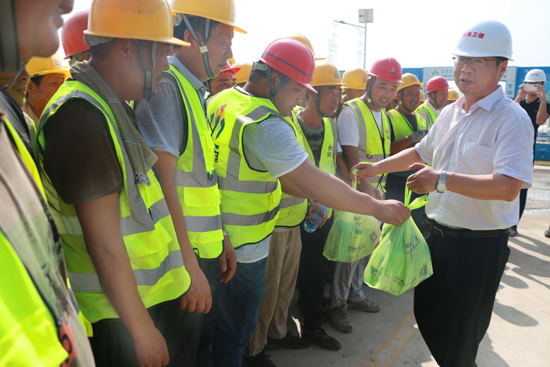 近日,县卫健委负责人深入县医院迁建项目工地,看望慰问顶烈日、冒酷暑,奋战在建设一线的工人,为他们送去西瓜、矿泉水、洗发水、毛巾、香皂、消毒液等防暑和生活用品。