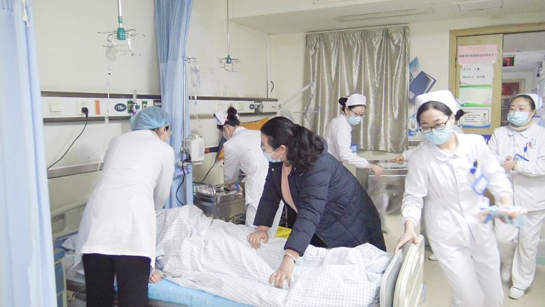 在演练现场,一位模拟的住院足月待产孕妇,自诉剧烈头痛,随即出现面色青紫、双眼上翻、全身抽搐、口吐白沫、意识丧失等症状,呼吸急促约30次/分。值班医师张小魏巡视病房发现后立即对其进行抢救,并呼叫其他医护人员。启动医院危急重症应急救治指挥中心,在医务科的组织协调下,心内科徐书灿、ICU陈国庆、麻醉科顾海东、神经内科徐艳等相关科室人员及时到位参加抢救,共同完成演练。