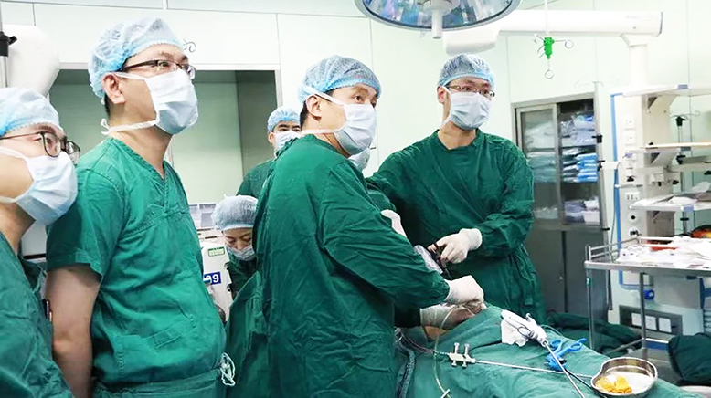 某女性患者入院后,经腹部CT、血液检查等显示左侧严重肾积水,肾脏功能受到一定损坏,肾脏结石数量多、位置高,呈聚集性。泌尿外科钱进科主任带领团队对患者进行详细的手术评估。根据患者的实际病情,泌尿外科团队决定使用一次性可弯曲负压鞘(万象鞘)直达结石部位,边打边吸,不但让结石无处可逃,提高清石效率,还使手术治疗时间缩短,减少并发症的发生和住院费用。