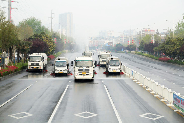 环卫所机械化深度洗扫作业车正在对海滨大道开展洗扫与降尘。