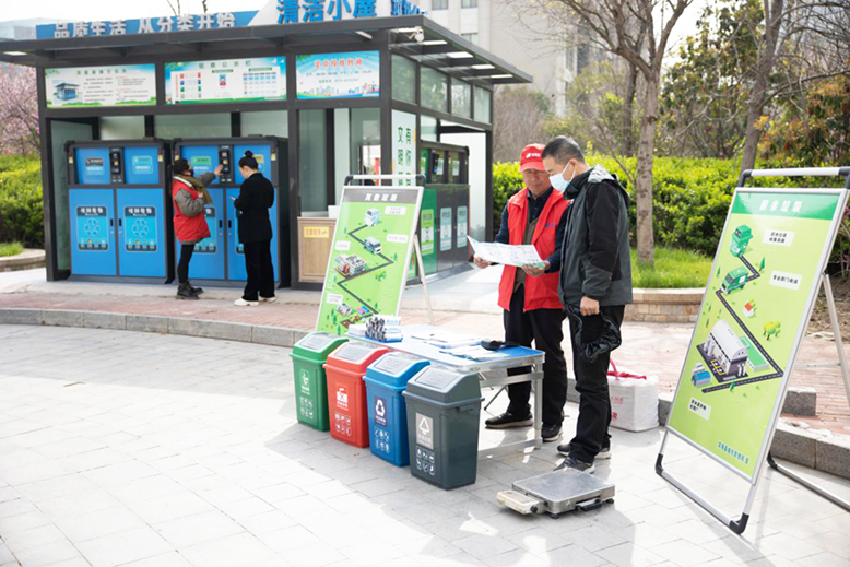 环卫所工作人员在翰林院小区开展垃圾分类宣传,指导居民正确投放垃圾。