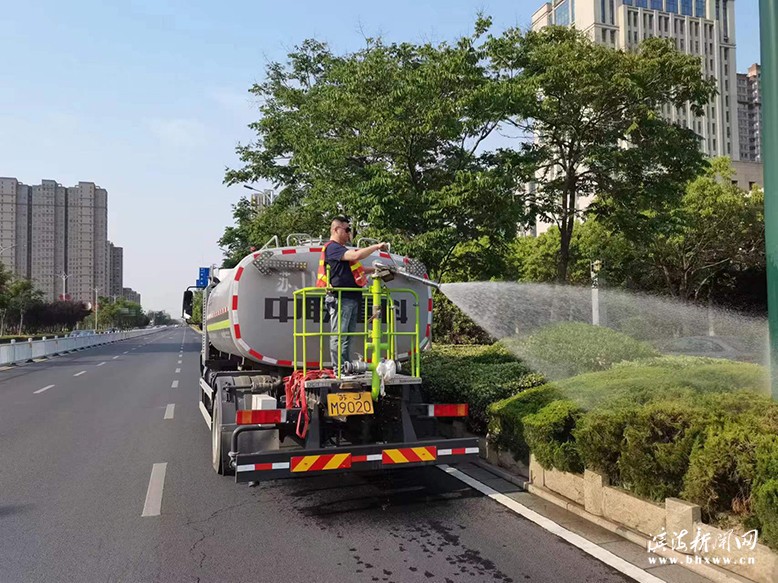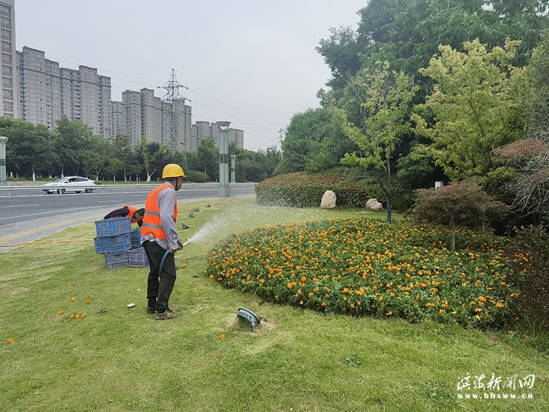 精细管护显成效。一是强化绿化巡查,根据天气预报、各地段绿化长势和土壤湿度等状况,及时制定和调整浇水计划,实现精准浇灌;二是采用车辆机械喷灌、人工引管浇灌等方式,做到浇水全覆盖,确保浇水效果;三是增加重点地段、旱情严重区域的浇水频次,确保浇足、浇透、浇匀、浇实;四是及时进行除草、松土,避免土壤板结,增强土壤蓄水保湿能力,提高浇灌效果。