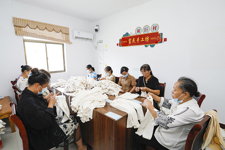 8月15日,记者在双巨村的“富民手工坊”看到,十几位老人围坐在一张长桌前,一边做着手工活,一边拉着家常,欢笑声不绝于耳,场面温馨和谐。“这个活很简单,就剪剪线头。村部不但提供专门的空调房,还免费提供茶水和午餐,一天下来还能挣七八十块钱,对我们来说是天大的好事!”村民黄静笑着告诉记者。