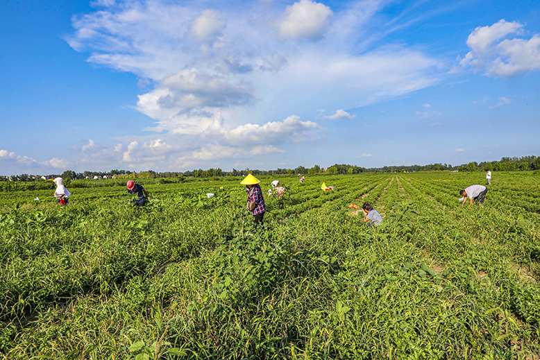 8月15日,记者在界牌镇周庄村菊花种植基地看到,村民们三五成群,正忙着给基地的菊花除草,田间不时传来阵阵欢笑声。